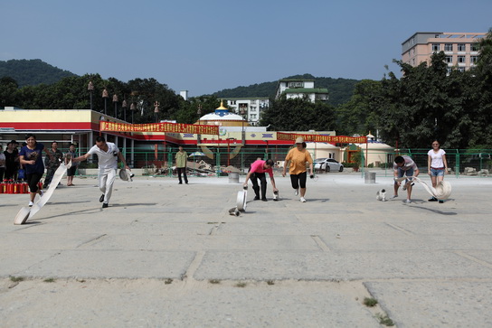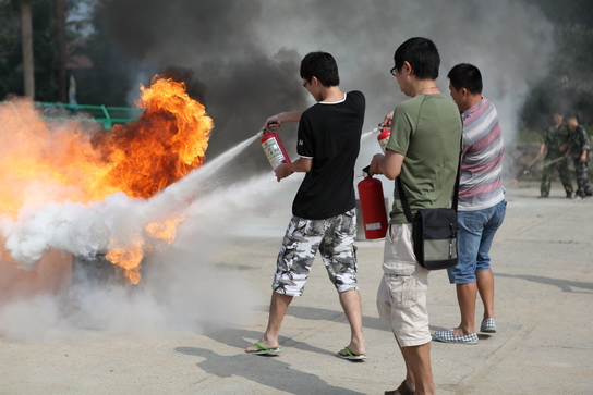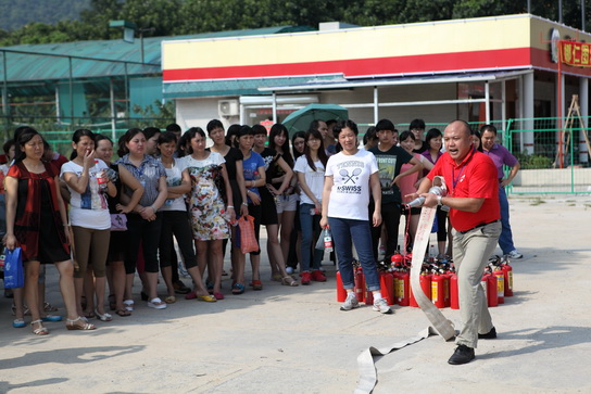 随后我们的队伍集中到总厂大门口的操场进行灭火的实操演练。保卫部部长谢秋生、康彦豪队长对演习所用器材都进行了一一检查,并再次详细讲解灭火器材的使用方法及注意事项,还手把手跟员工们一起参与到实际的灭火演练中来。活动开始,演习人员在起跑线站好,经警队员们同时点燃油桶,熊熊烈火马上燃烧起来,,只见演习人员立即跑到灭火器处,手提干粉灭火器上下摇晃几次,拨出保险销跑向火场,并在距离火点2-3米处,一手握紧喷嘴,对准火源根部,另一手的大拇指将压把按下,干粉立马喷出,他们还不断地摇摆喷嘴,使粉雾横扫桶内燃烧火焰的根部,由远而近,向前推移,很快将火扑灭。“厉害、漂亮、加油”,员工们的欢呼声此伏彼起。通过本此的实际演习,员工们都掌握了火灾发生后的处理步骤和灭火常识。