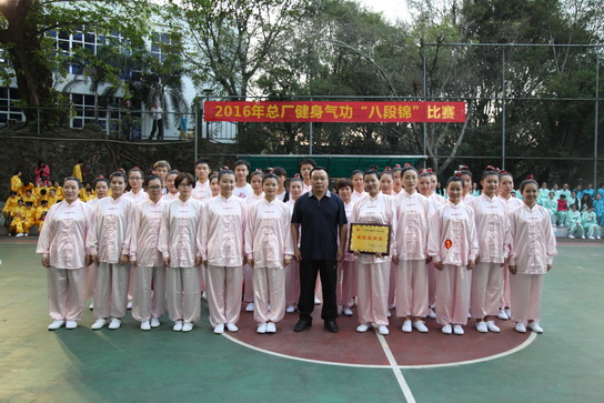 比赛的第一支队伍,即为我们第一制造部的“小白云”队。只见一群“仙童”——头上红、白轻纱飘扬,眉间“山”形额贴闪亮,身着浅粉赛服,脚踩白色便鞋,带着“常练八段锦绣功,助我白云腾飞扬”的口号,飘然入场。他们目光坚定,他们笑容灿烂;他们步伐有力,他们精神饱满;他们姿势优美,他们刚柔并济……伴随着“团结一部,爱我总厂”的号响,他们结束了表演。这场表演赢得了满堂的掌声,也赢得了裁判的青睐。最终,第一制造部以91分的高分获得了2016年总厂健身气功“八段锦”比赛的“最佳表演奖”。