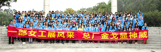 徐徐春风中我们迎来了春意盎然的三月,同时也迎来了一年一度的“三八”国际妇女节。为了让全体女员工过一个快乐、温馨、难忘而有意义的节日,根据总厂工会的部署,第一制造部开展了以“展巾帼风采,创金戈辉煌”为主题的庆祝活动。3月4日上午,第一制造部分会组织女职工等174人分乘四辆大客车,前往番禺莲花山,开始了休闲度假一日游活动。来到莲花山,我们首先集中拍了集体照,随后进行自由活动。我们统一的服饰,统一的“金戈”字帖,惹人注目的金戈片模型,灿烂的笑容,已然成为一道道靓丽的风景线,过路的游客不时投来艳羡的目光。