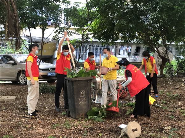 下午四点,参加活动人员准时到达后山宿舍区。活动现场,党员带领青年团员,有序分工,大家不顾高温,全情投入,打扫落叶,对绿化带内的堆积杂物、果皮纸屑进行清除,拔除野芋,将平时容易被忽视的角落细致地打扫干净。大家个个干劲十足,汗水飞扬,投射出一片热火朝天的劳动场景。经过一个多小时的劳动,附近的落叶、野草、杂物等被清理一空,原本脏乱的地面变得焕然一新。